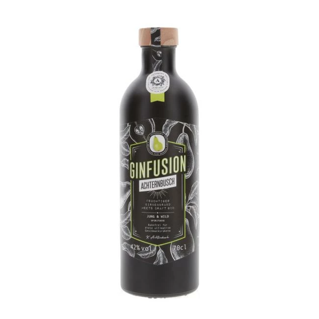 Beim Ginfusion Birne wird Gin mit Williams-Birnenbrand vermählt. Es wird kein Zucker zugesetzt und auch keine künstlichen Aromen, was dieses Experiment von Achternbusch zu einer fruchtigen Spirituose macht.