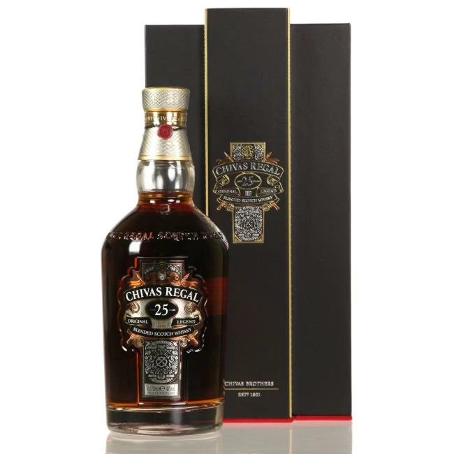 Der 25-jährige Blend Chivas Regal wurde 1909 eingeführt. Jede Flasche des raren Whiskys ist einzeln nummeriert. Bereits im Jahr 1801 wurde die erste Abfüllung von Chivas auf den Markt gebracht.