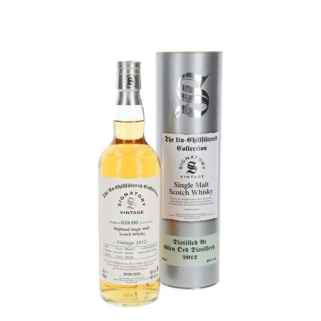 Dieser Glen Ord Single Malt gehört zur Un-Chillfiltered Reihe von Signatory, in der die Whiskys nicht kühlgefiltert wurden. Die Whiskys fallen dadurch besonders intensiv im Geschmack aus. Der 10-jährige Glen Ord wurde aus drei Bourbon Hogsheads vermählt, die auch auf dem Etikett genannt sind.