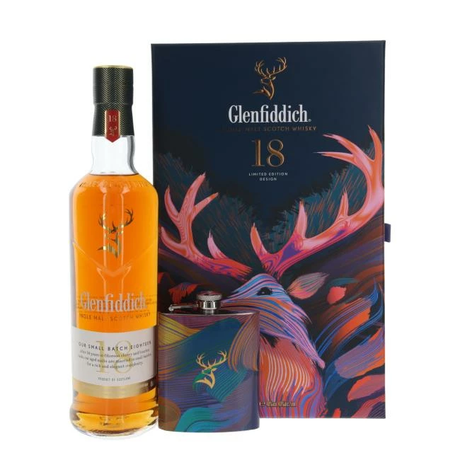 Glenfiddich Our Small Batch Eighteen reifte zuerst für 18 Jahre in Sherry-und Bourbonfässern. Master Distiller Brian Kinsman suchte anschließend 150 Fässer aus. In kleine Batches unterteilt, reifte der Malt zur Vermählung für weitere 3 Monate in hölzernen Mischgefäßen. Durch die Feder des finnischen Künstlers Santtu Mustonen erhielten die exklusiven 12, 15 und 18 Jahre alten Abfüllungen von Glenfiddich ein farbenfrohes Design, was den Hirsch der Brennerei in bunte Farben hüllt. So werden die Glenfiddich Klassiker kreativ und neu interpretiert. Die aufwendig gestaltete Umverpackung lässt sich wie ein Buch aufklappen und trägt ein persönliches Statement des Künstlers auf der Innenseite. Die durch eine Vertiefung gekonnt in Szene gesetzte Flasche präsentiert sich mit einem im gleichen Design entworfenen Flachmann.