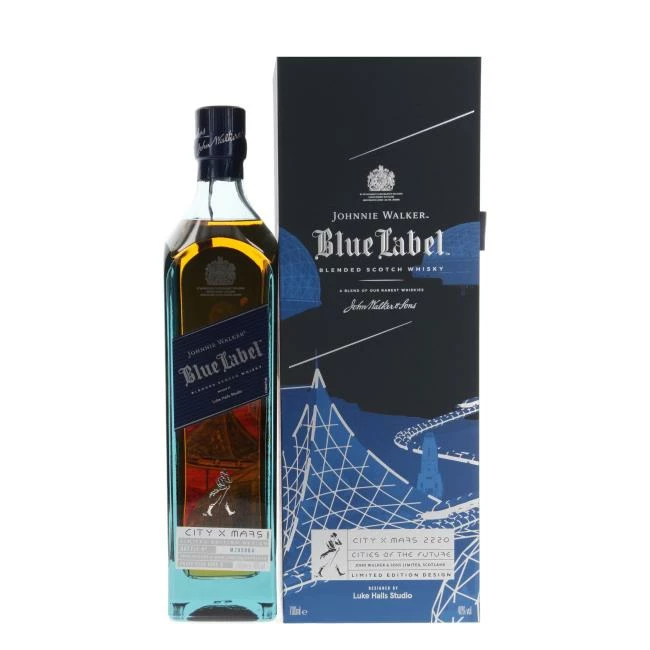 Im Johnnie Walker Blue Label finden sich auch sehr alte Malt Whiskys. Er gehört zur absoluten Spitze und kann sich mit jedem Single Malt messen. 80% Maltanteil sprechen für eine unvergleichliche Komplexität an Aromen. Dabei bleibt er weich, warm und mild. Die Cities of the Future Serie wurde in Zusammenarbeit mit dem Künstler Luke Hals gestaltet. So trägt jede Flasche eine Zukunftsvorstellung der Metropolen Berlin, London oder dem Mars auf dem Etikett.