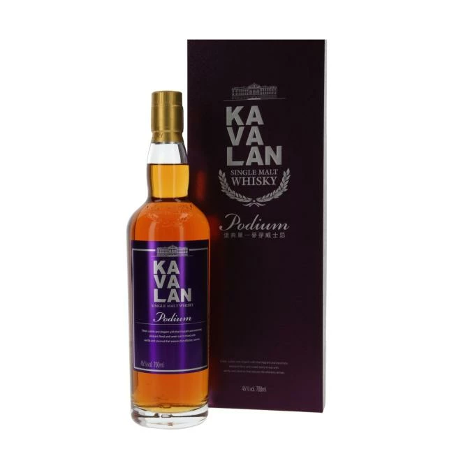 Kavalan Podium wurde zum vierjährigen Jubiläum der taiwanesischen Brennerei kreiert. Das subtropische Klima in Taiwan fördert eine schnellere Reifung des Whiskys. Dadurch ist eine permanente Kontrolle der Fässer erforderlich. Da der Angel’s Share bei 15-18% pro Jahr liegt, sind lange Lagerzeiten fast unmöglich.