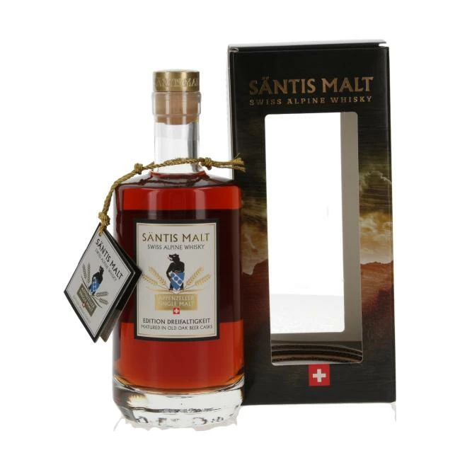 Säntis Dreifaltigkeit ist die rauchige Edition aus der Schweizer Brennerei Locher. Dafür wird das Malz über einer Mischung von Hochmoortorf, Apfel-, Buchen- und Eichenholzspänen gedarrt. Nach der mehrjährigen Reifung in Bierfässern wird der Schweizer Malt abgefüllt.